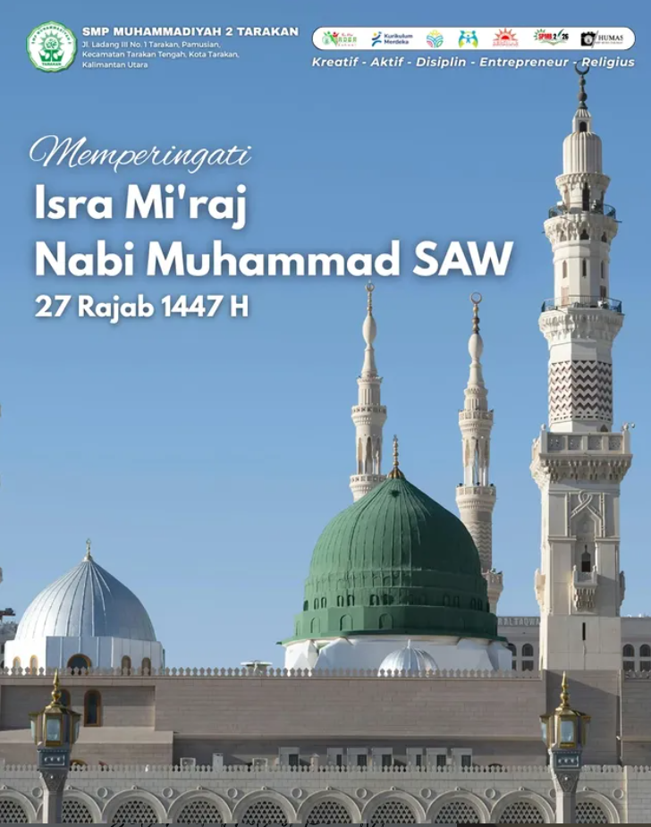 Keluarga besar SMP Muhammadiyah 2 Tarakan mengucapkan selamat memperingati Isra Mi’raj Nabi Muhammad SAW, 27 Rajab 1447 H. Peristiwa agung ini menjadi salah satu mukjizat terbesar dalam sejarah Islam, di mana Allah SWT memperjalankan Rasulullah SAW dari Masjidil Haram ke Masjidil Aqsha, lalu naik ke Sidratul Muntaha dalam satu malam yang penuh kemuliaan.