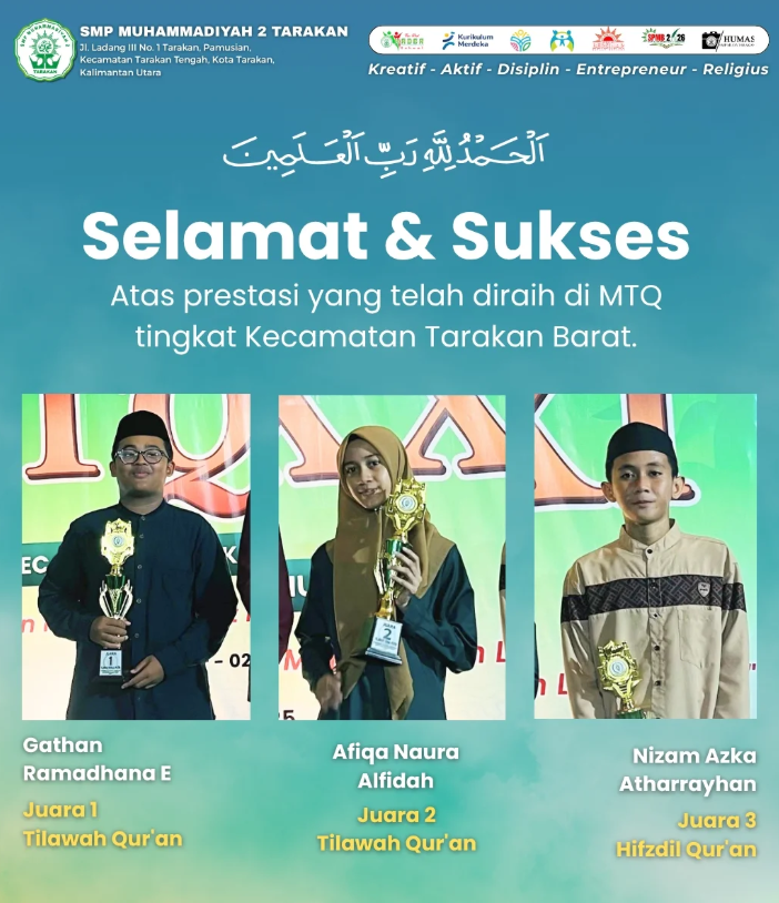 Siswa-siswi SMP Muhammadiyah 2 Tarakan (SMP Muda) kembali menorehkan prestasi membanggakan dalam ajang Musabaqah Tilawatil Qur’an (MTQ) tingkat Kecamatan Tarakan Barat. Keberhasilan ini memperkuat reputasi sekolah sebagai lembaga pendidikan yang tidak hanya unggul secara akademik tetapi juga dalam pembinaan karakter dan nilai-nilai keislaman.