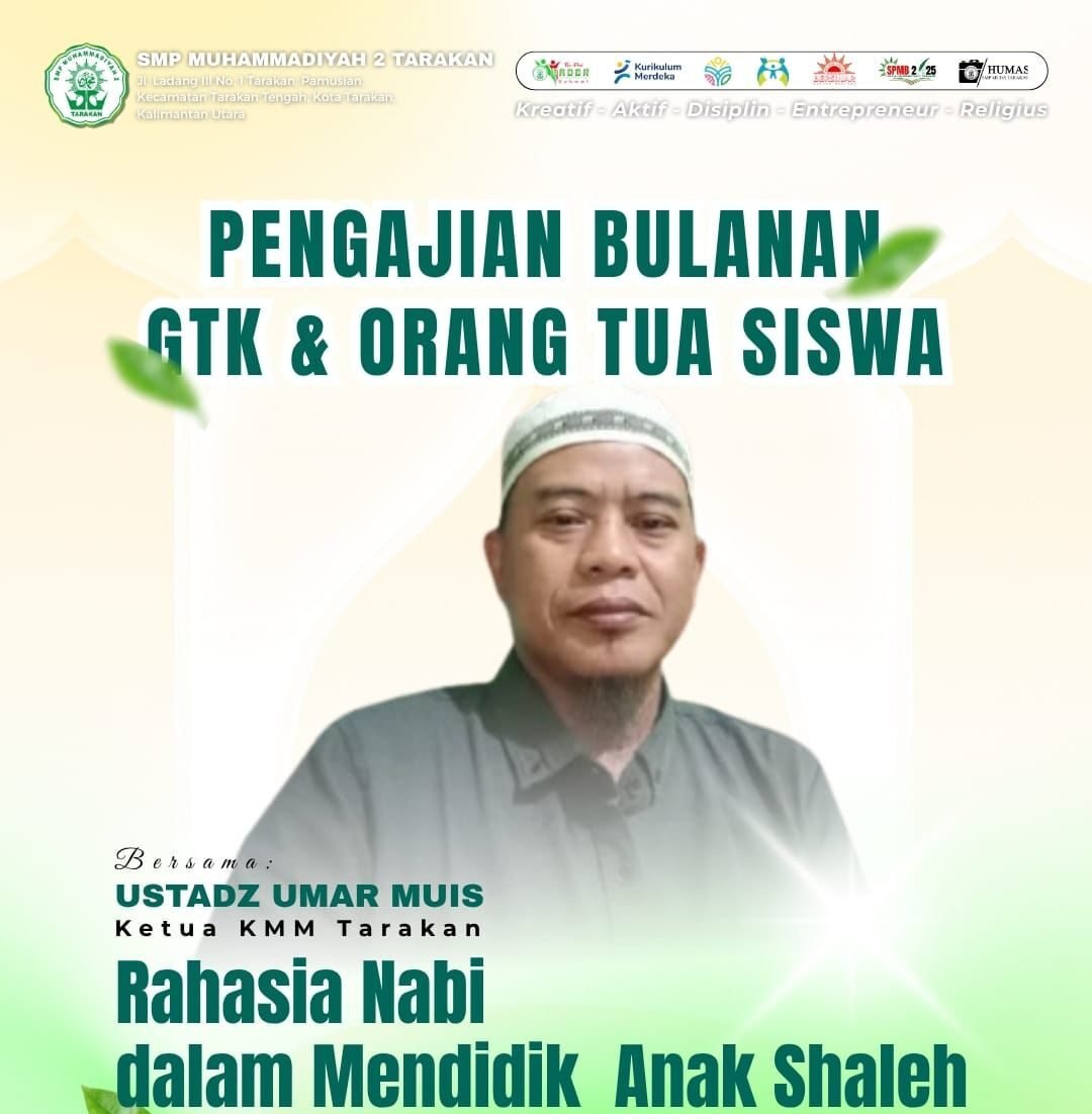 Rasulullah ﷺ menanamkan akhlak mulia kepada anak sejak dini, dimulai dengan keteladanan dalam tutur kata dan perilaku. Prinsip ini menjadi inti pesan yang disampaikan Ustadz Umar Muis, Ketua Komunitas Muslim Madani (KMM) Tarakan, dalam pengajian bulanan SMP Muhammadiyah 2 Tarakan bersama orang tua siswa, guru, dan tenaga kependidikan, Sabtu (9/8/2025).