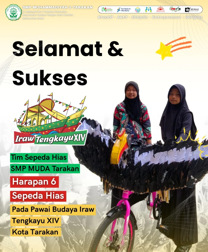 SMP Muhammadiyah 2 Tarakan (SMP Muda) kembali menorehkan prestasi membanggakan di kancah budaya kota. Tim Sepeda Hias sekolah ini berhasil meraih Juara Harapan 6 dalam Pawai Budaya Iraw Tengkayu XIV Kota Tarakan, yang mengusung tema “Ruang Bersama Tarakan Hibot Bahagia Merdeka Berbudaya”.