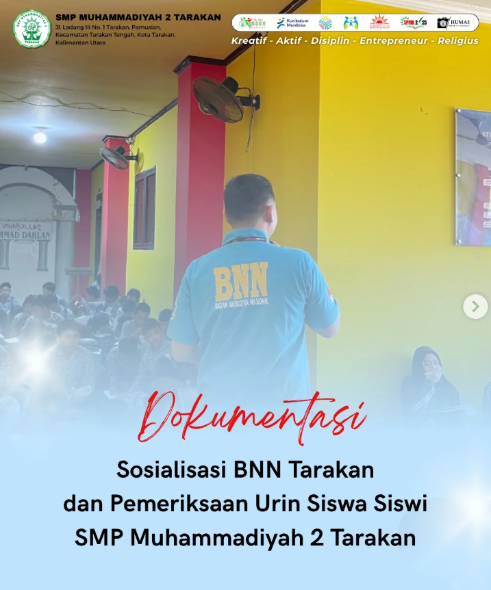 SMP Muhammadiyah 2 Tarakan (SMP Muda) menunjukkan komitmennya dalam membentengi siswa dari bahaya narkoba dengan menyelenggarakan kegiatan Sosialisasi Badan Narkotika Nasional (BNN) Kota Tarakan, disertai pemeriksaan urine bagi siswa-siswi. Kegiatan ini merupakan langkah proaktif sekolah dalam menciptakan lingkungan belajar yang bersih dan sehat.