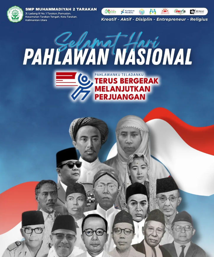 Segenap keluarga besar SMP Muhammadiyah 2 Tarakan turut memperingati Hari Pahlawan Nasional dengan penuh khidmat. Pada momentum yang mulia ini, kami mengajak seluruh civitas akademika untuk senantiasa meneladani nilai-nilai kepahlawanan dalam kehidupan sehari-hari.