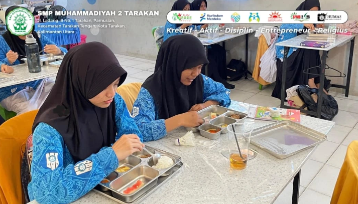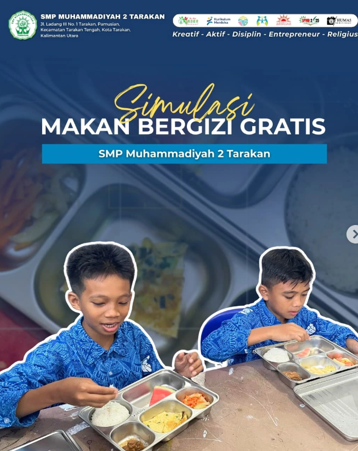 SMP Muhammadiyah 2 Tarakan (SMP Muda) telah melaksanakan simulasi perdana Program Makan Siang Gratis (MBG) pada Jumat, 29 Agustus 2025. Kegiatan ini merupakan langkah awal persiapan penerapan program pemerintah yang bertujuan meningkatkan gizi dan kualitas sumber daya manusia, khususnya bagi anak-anak usia sekolah.